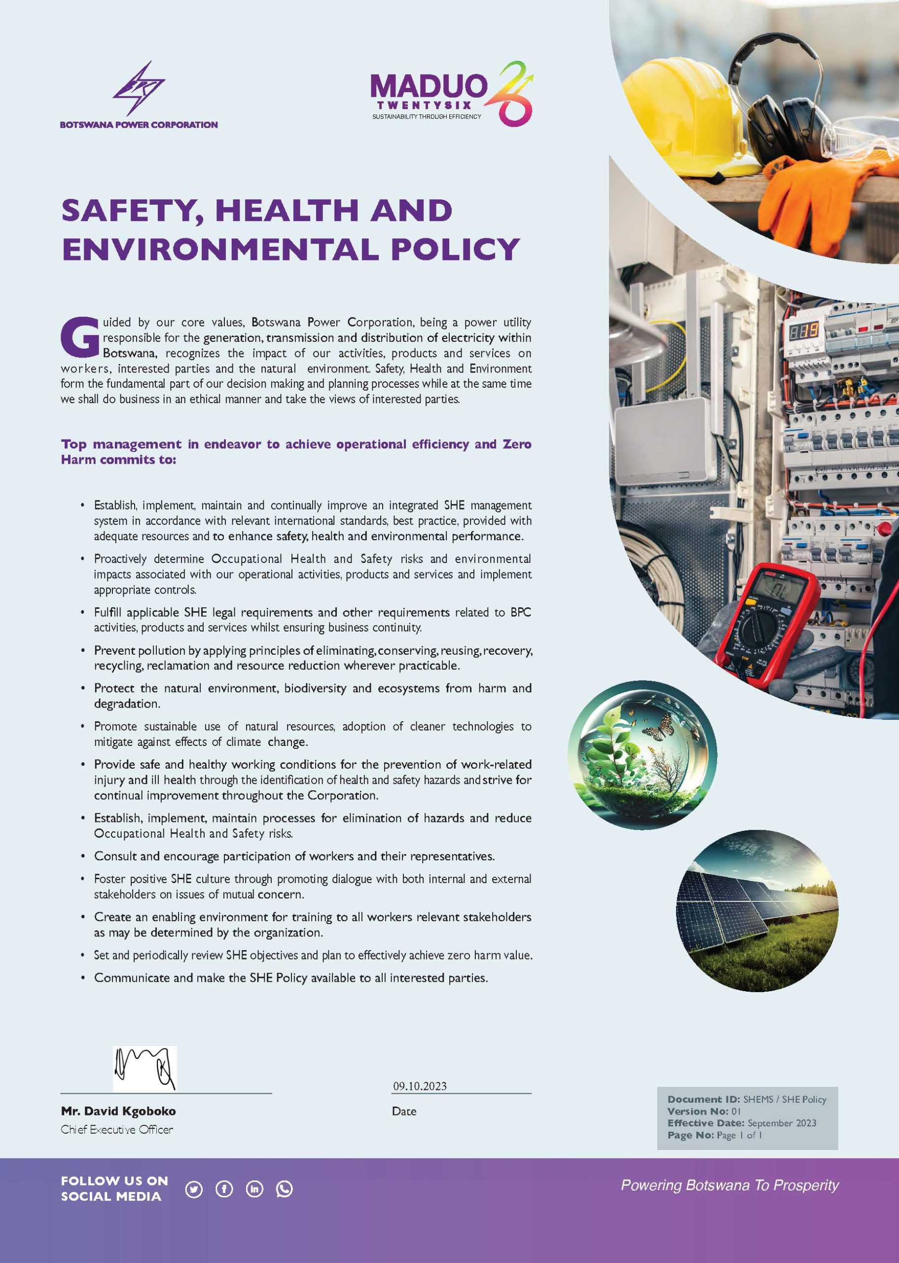 It is the policy of BOTSWANA POWER CORPORATION to provide all employees with a work environment which will protect, maintain and foster employees safety, health and environment